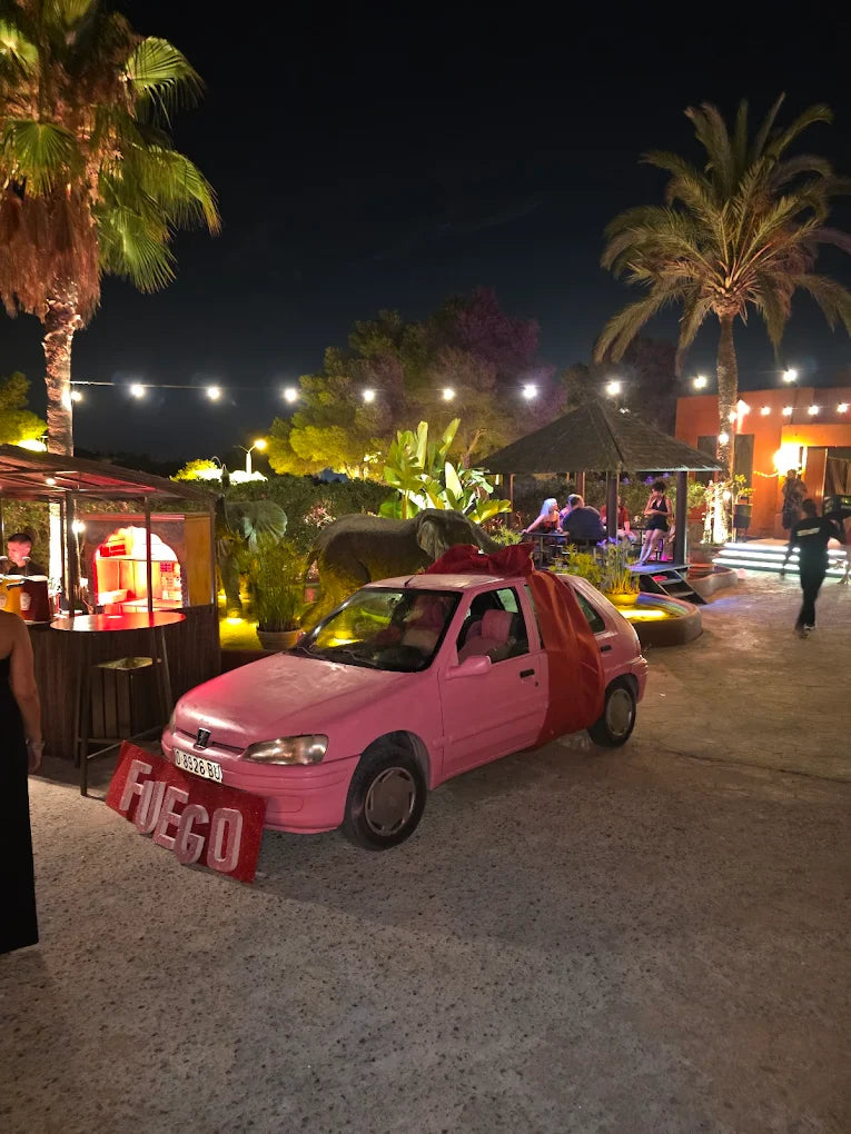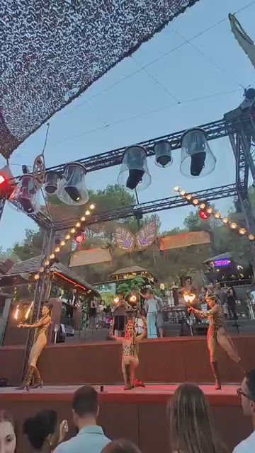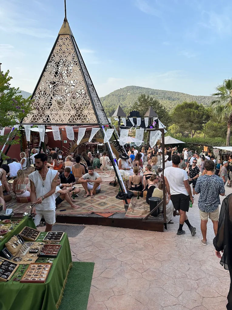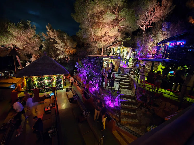 Cova Santa’s layout is central to its identity. Early hours revolve around its restaurant and terrace, where long tables, hillside views, and a relaxed tempo define the experience. As the night develops, the outdoor dancefloor becomes the focal point, framed by trees, stone, and open air. The cave itself adds a symbolic dimension, giving the venue both its name and a sense of grounding within the landscape.