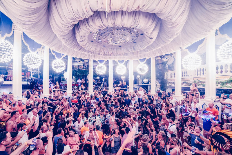 The venue opened in 1975, founded by Pepe Aguirre, and quickly became known for its striking architecture. Unlike many clubs that evolved from simpler spaces, Es Paradis was conceived with aesthetics at its core. White columns, arches, and layered terraces give the interior a garden-like atmosphere, creating a sense of openness despite being fully enclosed.