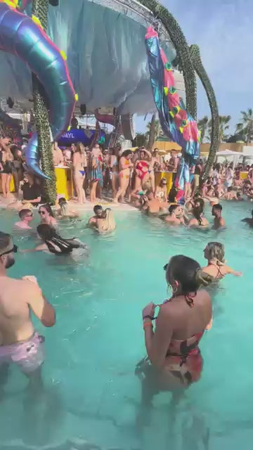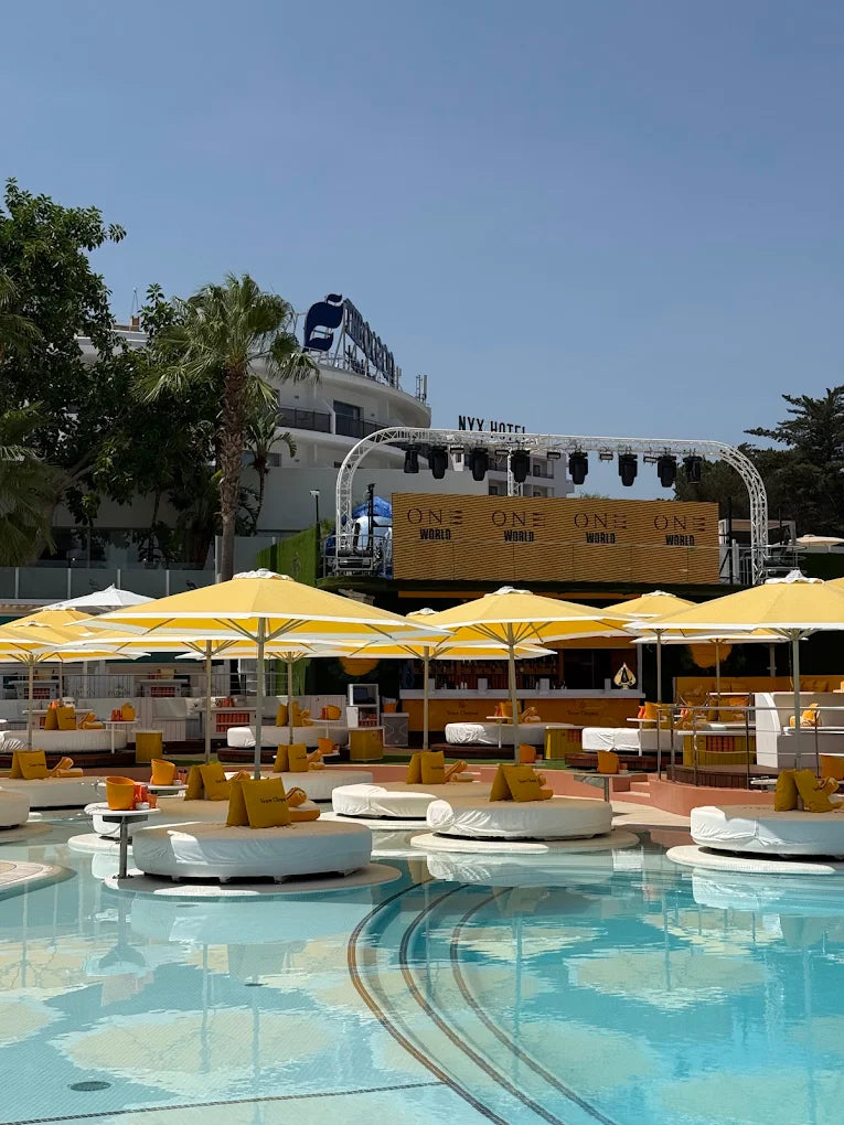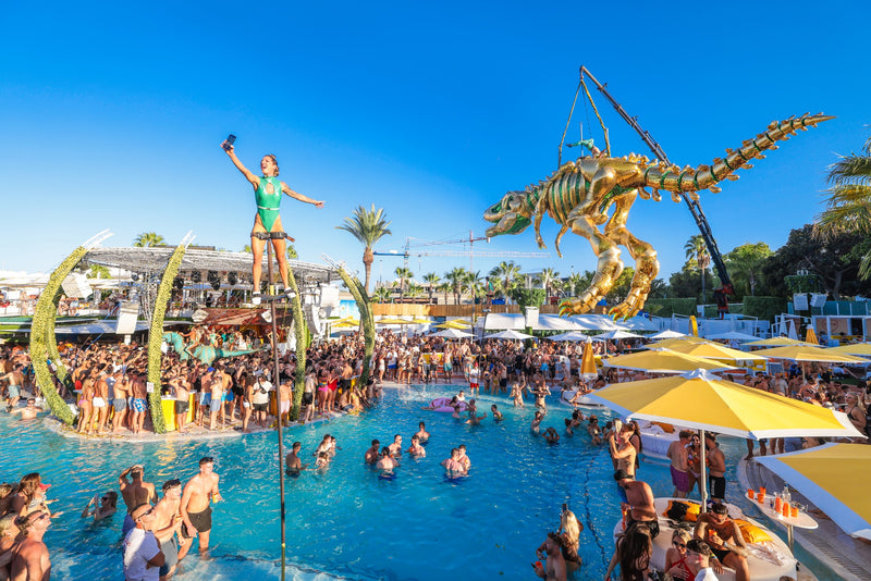 O Beach Ibiza is built around daylight, color, and performance. Located on the San Antonio seafront, it operates as a poolside venue where music, entertainment, and visual staging come together in a format designed for daytime celebration rather than late-night immersion.